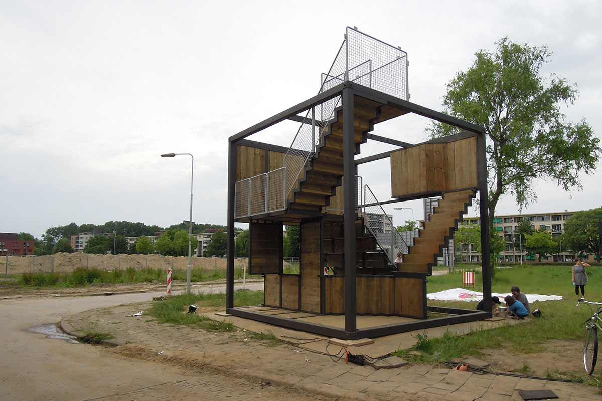 ‘Chuck-a-Luck’ relates to the German word ‘Glückswurf’ meaning ‘lucky throw’. And for the neighbourhood, a new housing estate near Arnhem in the Netherlands, the cube-like sculpture designed by Raumlabor Berlin was also to become one. The challenge was to create an open steel structure measuring 5×5 metres, which could quickly and easily be converted depending on the situation and thus has an activating effect on the residents.