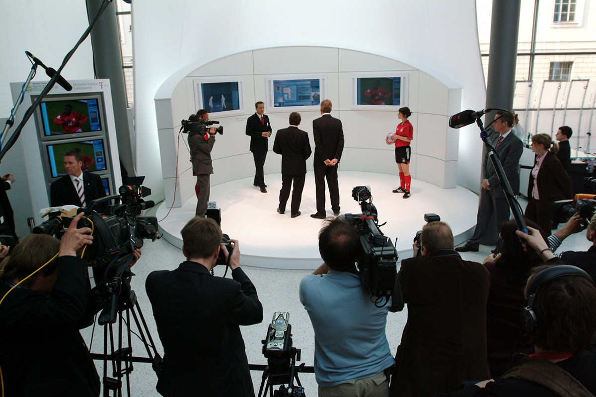 We were commissioned to design the stage for the opening of Deutsche Telekom Laboratories. The importance of futurology for the growth of the company was symbolized by huge columns which sprout organically and wildly from the stage. We produced the impressive effect using simple means: we covered steel rings with white ‘stretch stockings’.