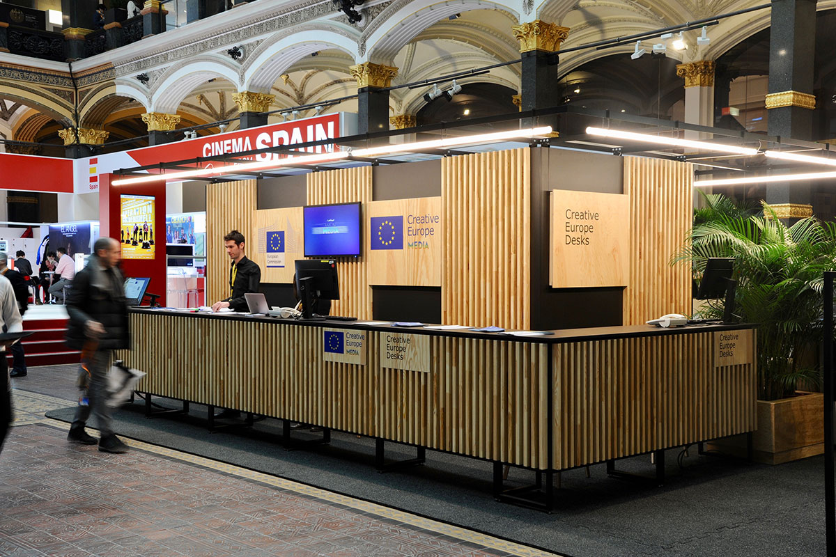 At 175 square metres, the stand for the European Film Funding Media is one of the largest at the European Film Market (EFM) at the Berlinale in Berlin. kubix’s re-design and its implementation focused on sustainability and a respectful relationship to the building in which it was built: All materials were recyclable and the Martin-Gropius-Bau’s historic atrium level was integrated into the stand.