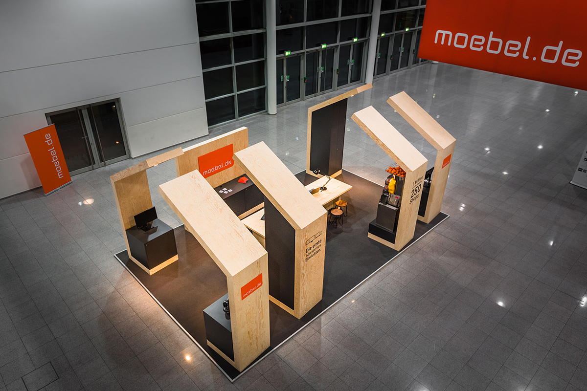 Our booth design for online portal moebel.de at the IMM Cologne used a modular approach. The booth concept united modernity, functionality and openness within a small area.