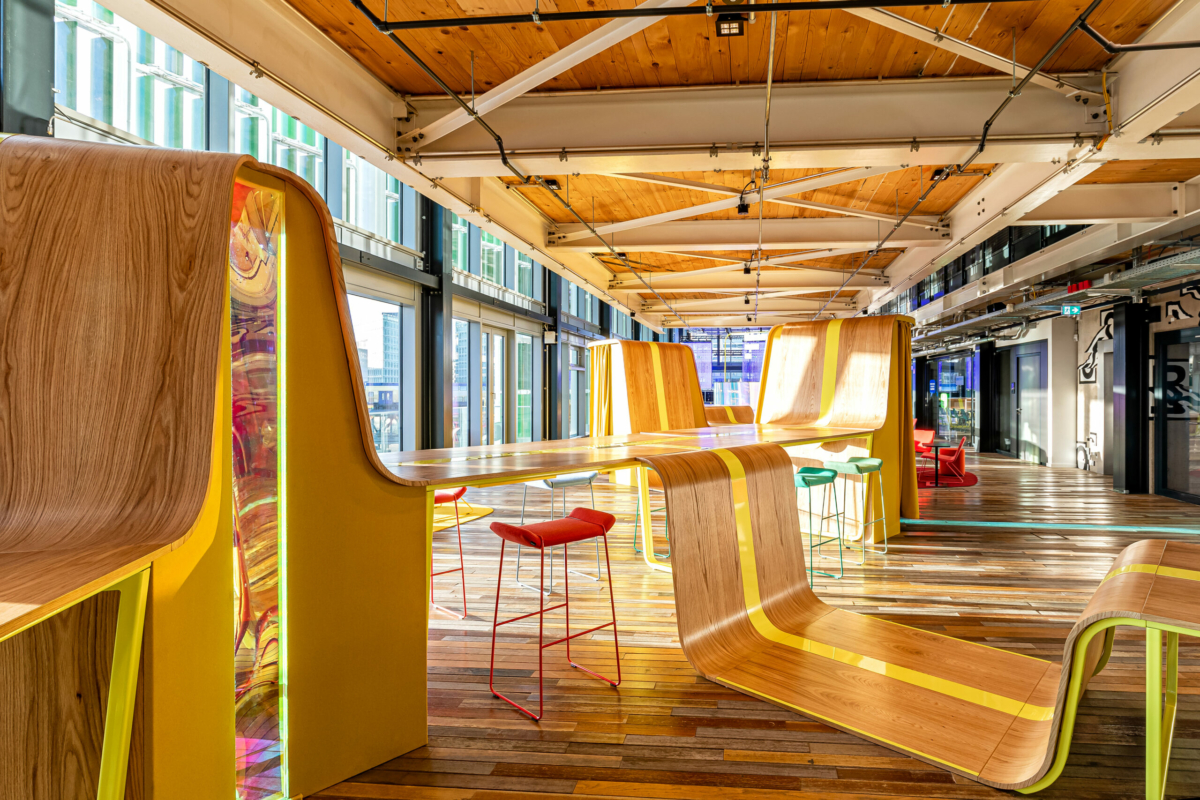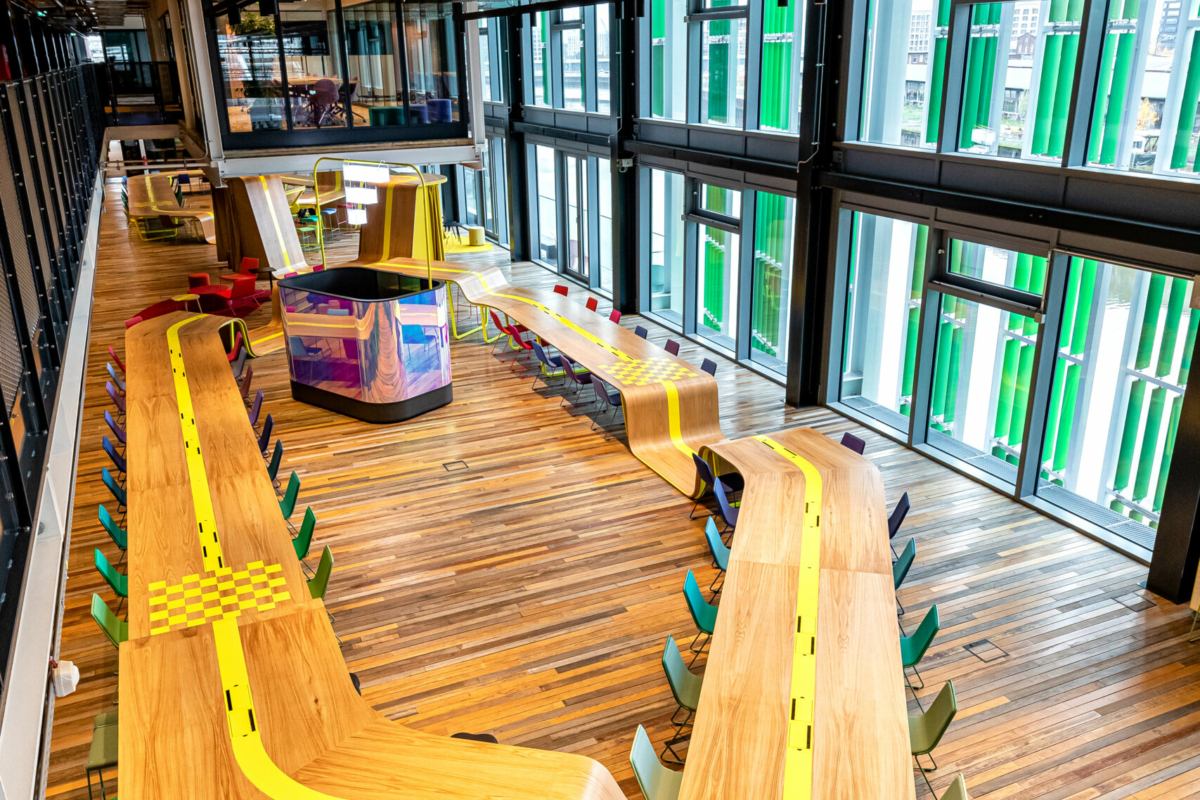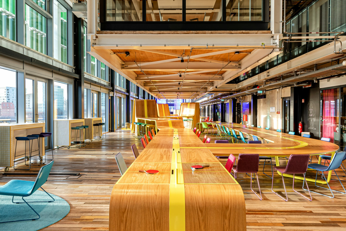 hat kubix zur Umsetzung einiger maßgeblicher Möblierungselemente beigetragen. Im Mittelpunkt des Gebäudes steht der Big Table. Als Unendlichkeitssymbol lädt das circa 80 Meter lange Centerpiece in offener Atmosphäre zum Arbeiten in kleinen oder größeren Gruppen ein.