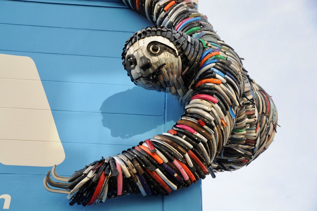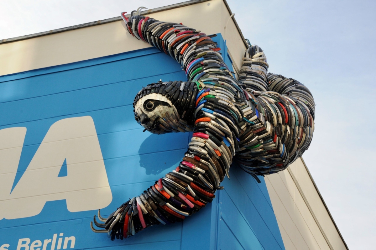 150 Tiere bevölkern die Arche im ANOHA, der Kinderwelt des Jüdischen Museums Berlin. Das Größte und Prominenteste unter ihnen ist ein Faultier, das sich an der Fassade der W. M. Blumenthal Akademie in Kreuzberg entlang hangelt und Besucher*innen den Weg weist. Komponenten alter, gebrauchter Fahrräder dienten dem Bau des circa vier Meter hohen und vier Meter breiten Exponats. Individuell ausgesuchte Schutzbleche visualisieren die feine Haarstruktur, die langen Krallen und die charakteristische Augenform des sympathischen Säugetieres. Damit steht es exemplarisch für die gesamte Museumsfauna, die mit viel Experimentierfreunde aus gebrauchten Gegenständen und Recyclingmaterialien erdacht und umgesetzt wurde. Eine besondere Vorbereitung erforderte auch die dynamische Haltung des großen und schweren Faultieres, das sich um die Ecke der Fassade zu bewegen scheint. Nach den ersten Skizzen entstand ein Knetmodell, das später 3D-gescannt wurde, um die Unterkonstruktion des metallenen Objekts zu planen. Das Ergebnis ist eine eigens entwickelte Statik, die dem Faultier auch bei Wind und Wetter einen starken Grip garantiert.