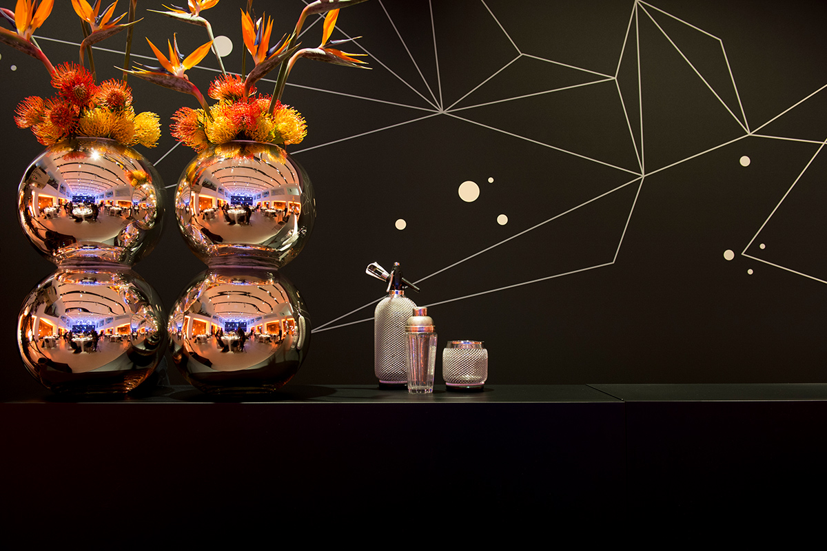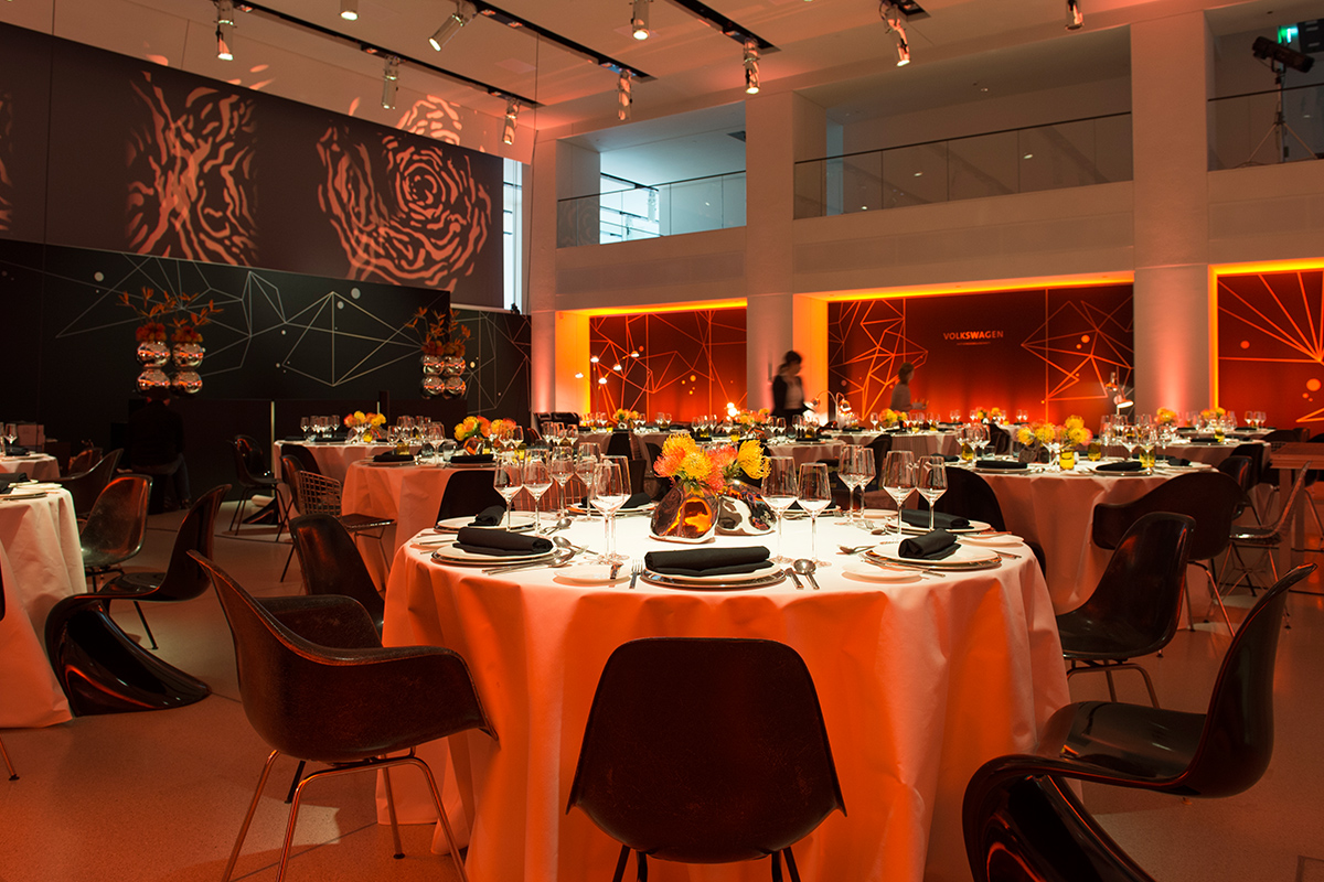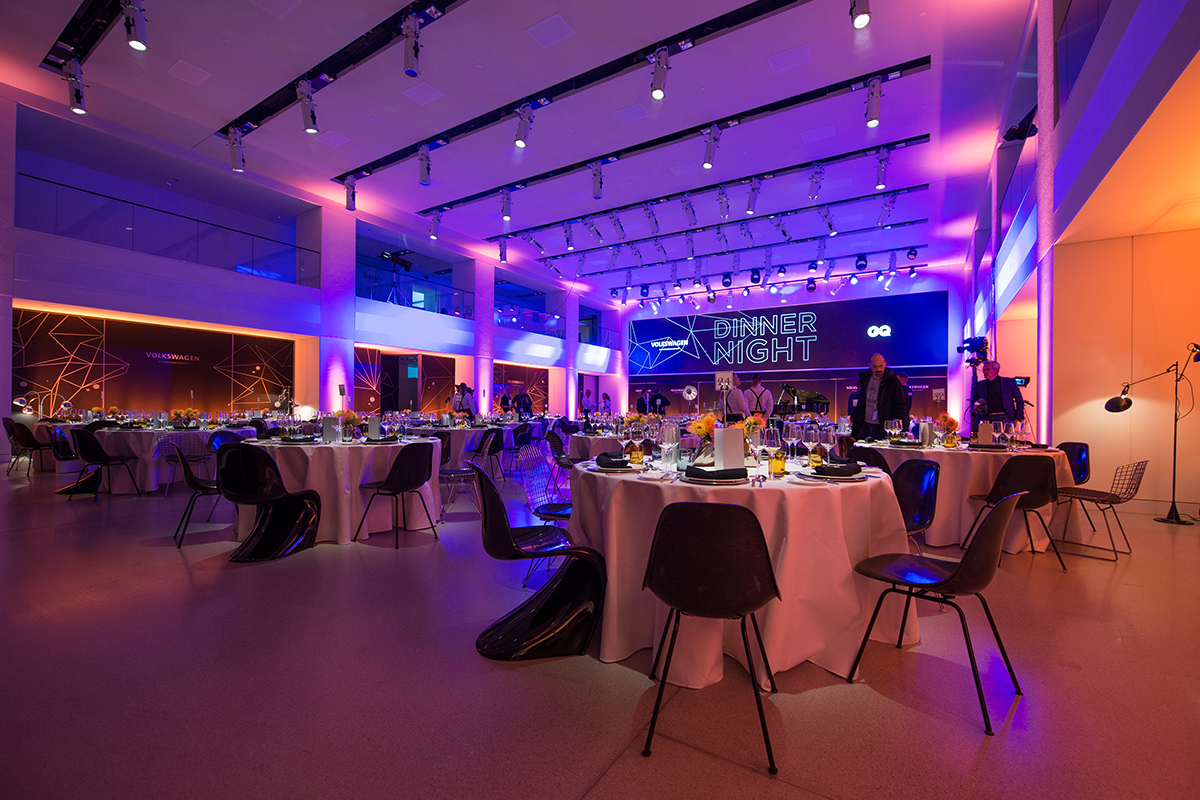 Den äußeren Rahmen der Gala realisierte kubix und sorgte für eine völlig veränderte Atmosphäre in der normalerweise weißen Ausstellungsfläche mit individueller Anpassung von Mietmöbel- und Grafikhandling.