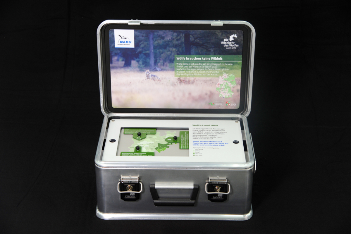 kubix hat für die interaktiven Exponate zehn Koffer entwickelt, die symbolisch für die reisenden Wolfsfamilien stehen.